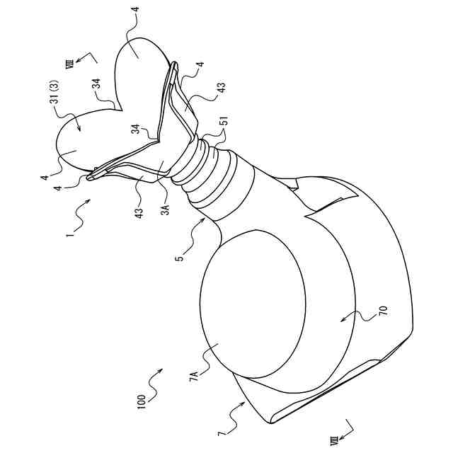 前記径方向の外側、且つ、前記軸方向における基端側に向けて凸の曲面状となる第二状態と、に変形可能である。
