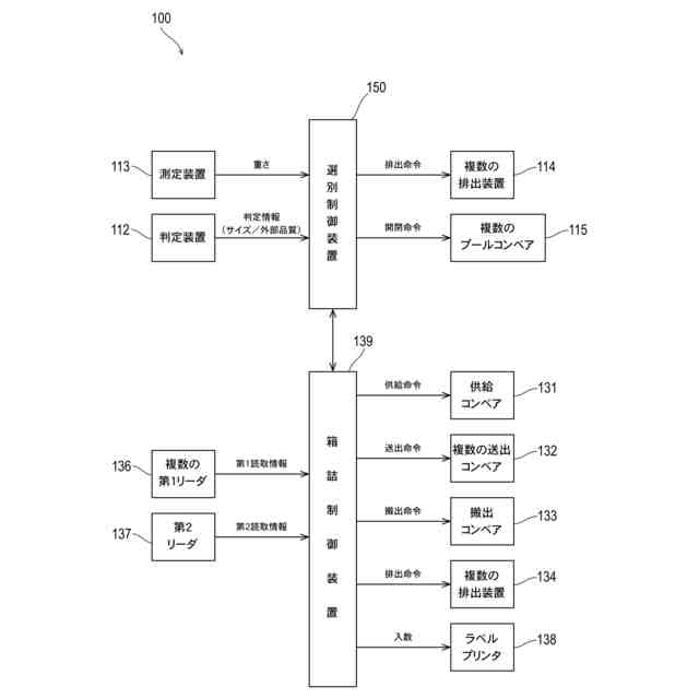 【解決手段】農産物の重さを測定する重さ測定部113と、選別コンベア111下流側に設けられた複数のプールコンベア115と、プールコンベアの各々に対応する箱詰エリアEと、農産物が入れられた外装箱に入数を表示させるラベルプリンタ138と、重さ測定部とラベルプリンタと通信可能な制御装置と、を備える。制御装置は、重さ測定部から取得した農産物の重さに基づいてプールコンベアの各々における農産物の総重量である貯留重量を算出するとともに、プールコンベアの各々における農産物の数をカウントする演算部と、プールコンベアの各々の貯留重量と外装箱に対して定められた総重量である梱包重量を比較する比較部と、プールコンベアの貯留重量が梱包重量に達した場合に、カウントされた農産物の数を入数としてラベルプリンタに指定する指定部と、を備える。