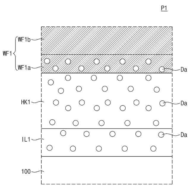 前記第1仕事関数層は、前記第1金属パターン内の第1金属元素及び前記第1高誘電パターン内のダイポール物質を含み、