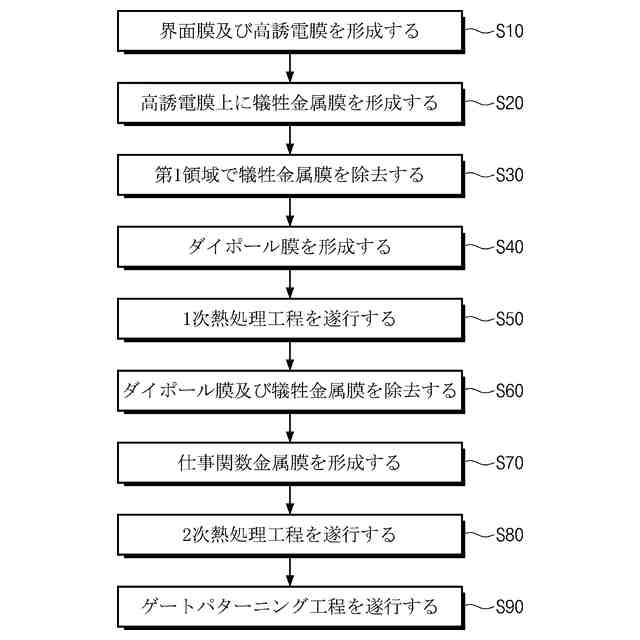 上記目的を達成するためになされた本発明の更に他の態による半導体装置は、セルアレイ領域と第1領域及び第2領域を含む周辺領域とを含む半導体基板と、前記セルアレイ領域のセル活性領域、前記第1領域の第1活性領域、及び前記第2領域の第2活性領域を定義する素子分離膜と、前記セルアレイ領域のセル活性領域を横切るビットライン構造体と、前記第1活性領域上に配置される第1ゲート構造体と、前記第2活性領域上に配置される第2ゲート構造体と、を備え、前記第1ゲート構造体は、第1ゲート電極、前記第1ゲート電極と前記半導体基板との間の第1界面パターン、前記第1界面パターンと前記第1ゲート電極との間の第1高誘電パターン、及び前記第1高誘電パターンと前記第1ゲート電極との間の第1金属パターンを含み、前記第2ゲート構造体は、第2ゲート電極、前記第2ゲート電極と前記半導体基板との間の第2界面パターン、前記第2界面パターンと前記第2ゲート電極との間の第2高誘電パターン、及び前記第2高誘電パターンと前記第2ゲート電極との間の第2金属パターンを含み、前記ビットライン構造体は、一方向に沿って延長されるビットライン及び前記ビットラインと前記セル活性領域との間のビットラインコンタクトパターンを含み、前記第1高誘電パターン及び前記第1高誘電パターンに接する前記第1ゲート電極の下部部分は、ダイポール物質を含み、前記第2高誘電パターンは、前記第2界面パターンに隣接する下部部分及び前記第2金属パターンに隣接する上部部分を含み、前記第2高誘電パターンの前記上部部分の酸素含量は、前記下部部分の酸素含量よりも大きい。