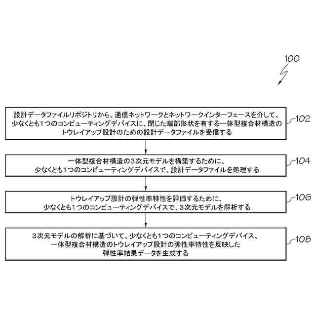 [0005] 一実施例では、閉じた端部形状を有する一体型複合材構造のトウレイアップ設計を解析するための開示される方法が、(1)設計データファイルリポジトリから、通信ネットワークとネットワークインターフェースを介して、少なくとも1つのコンピューティングデバイスに、閉じた端部形状を有する一体型複合材構造のトウレイアップ設計のための設計データファイルを受信すること、(2)一体型複合材構造の3次元モデルを構築するために、少なくとも1つのコンピューティングデバイスで、設計データファイルを処理すること、(3)トウレイアップ設計の弾性率特性(modulus characteristics)を評価するために、少なくとも1つのコンピューティングデバイスで、3次元モデルを解析すること、及び(4)3次元モデルの解析に基づいて、少なくとも1つのコンピューティングデバイスで、一体型複合材構造のトウレイアップ設計の弾性率特性を反映した弾性率結果データを生成することを含む。
