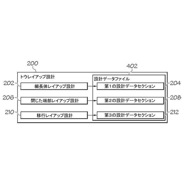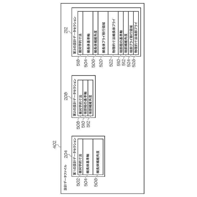 前記細長い中空体(304)のトウレイアップ用の細長体プライの複数のセットを規定する前記設計データファイル(402)内の第1の設計データセクション(204)を含む細長体レイアップ設計(202)、