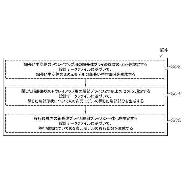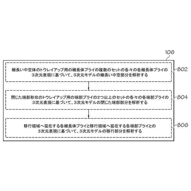 [0007] 更に別の一実施例では、閉じた端部形状を有する一体型複合材構造のトウレイアップ設計を解析するための更に別の開示される方法が、(1)設計データファイルリポジトリから、閉じた端部形状を有する一体型複合材構造のトウレイアップ設計のための設計データファイルを選択すること、(2)一体型複合材構造の3次元モデルを構築するために、少なくとも1つのコンピューティングデバイスで、設計データファイルを処理すること、(3)トウレイアップ設計の弾性率特性を評価するために、少なくとも1つのコンピューティングデバイスで、3次元モデルを解析すること、(4)3次元モデルの解析に基づいて、少なくとも1つのコンピューティングデバイスで、一体型複合材構造のトウレイアップ設計の弾性率特性を反映した弾性率結果データを生成すること、及び(5)(i)弾性率結果データを、少なくとも1つのコンピューティングデバイスがアクセス可能なデータストレージデバイスに記憶すること、(ii)弾性率結果データを、少なくとも1つのコンピューティングデバイスがアクセス可能な印刷デバイスで印刷すること、(iii)弾性率結果データを、少なくとも1つのコンピューティングデバイスがアクセス可能なディスプレイデバイスで表示すること、及び(iv)弾性率結果データが利用可能であることの通知と、弾性率結果データにアクセスするための指示と、を提供するメッセージを、少なくとも1つのコンピューティングデバイスに関連付けられたオペレータに送信すること、のうちの少なくとも1つを実行することを含む。