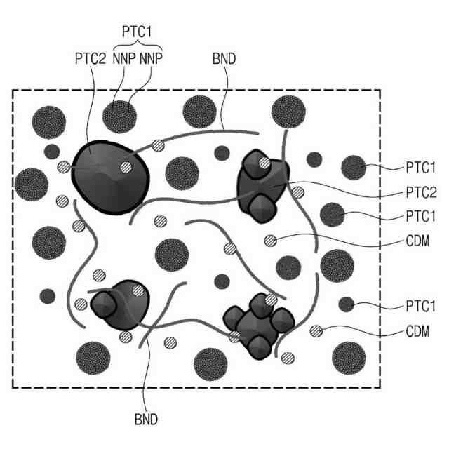 下記の化学式2の化合物を含み、前記第1平均粒径より大きい第2平均粒径を有する第2粒子と、を含み、