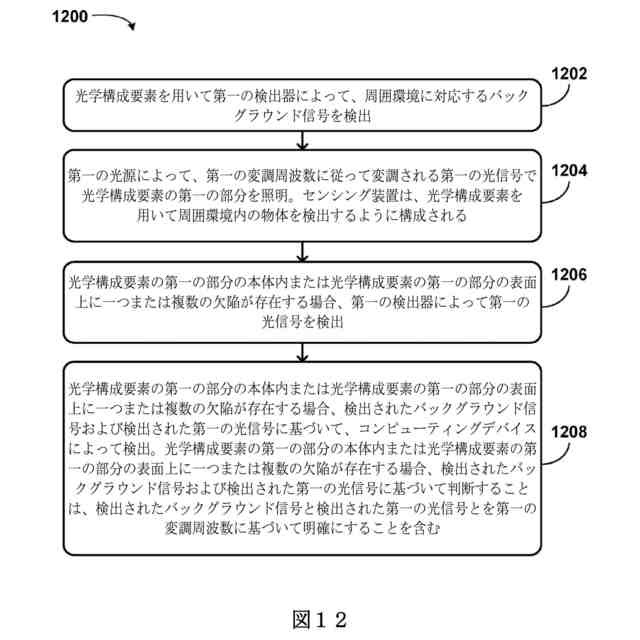 第三の態様では、コンピューティングデバイスが提供される。コンピューティングデバイスは、光学構成要素の第一の部分の本体内または光学構成要素の第一の部分の表面上に一つまたは複数の欠陥が存在する場合、検出されたバックグラウンド信号および検出された第一の光信号に基づいて判断するように構成される。光学構成要素の第一の部分の本体内または光学構成要素の第一の部分の表面上に一つまたは複数の欠陥が存在する場合、検出されたバックグラウンド信号および検出された第一の光信号に基づいて判断することは、第一の変調周波数に基づいて、検出されたバックグラウンド信号と検出された第一の光信号とを明確にすることを含む。検出されたバックグラウンド信号は周囲環境に対応し、光学構成要素を用いて第一の検出器によって検出された。センシング装置は、光学構成要素を用いて周囲環境内の物体を検出するように構成される。光学構成要素の第一の部分は、第一の光源による第一の光信号によって照明された。第一の光信号は、第一の変調周波数に従って変調された。第一の光信号は、光学構成要素の第一の部分の本体内または光学構成要素の第一の部分の表面上に一つまたは複数の欠陥が存在する場合、第一の検出器によって検出された。