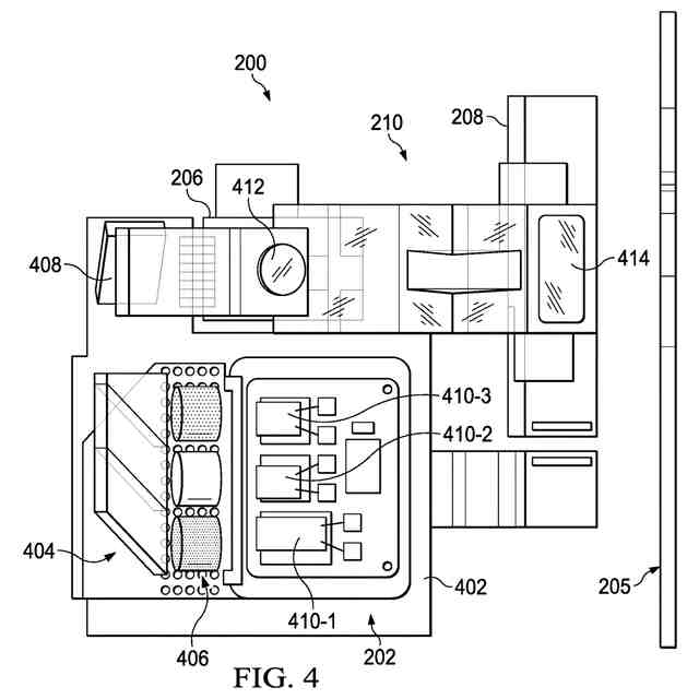 いくつかの実施形態による、WHUD内に配設されたレーザ投影システムの部分透過背面等角図を示す図である。