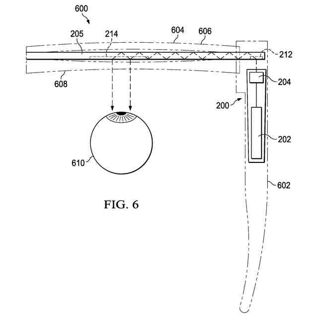 いくつかの実施形態による、レーザ投影システムを含むウェアラブルヘッドアップディスプレイ(WHUD)の部分透過図を示す図である。
