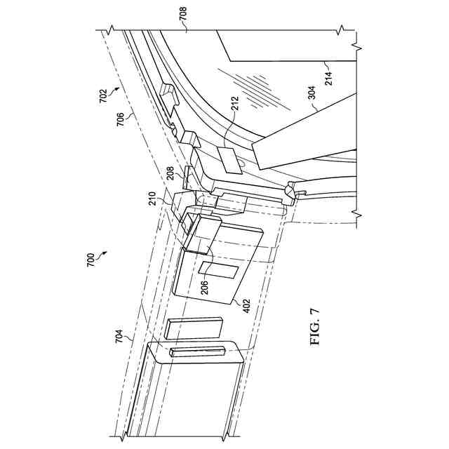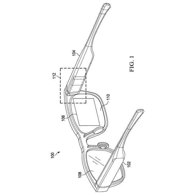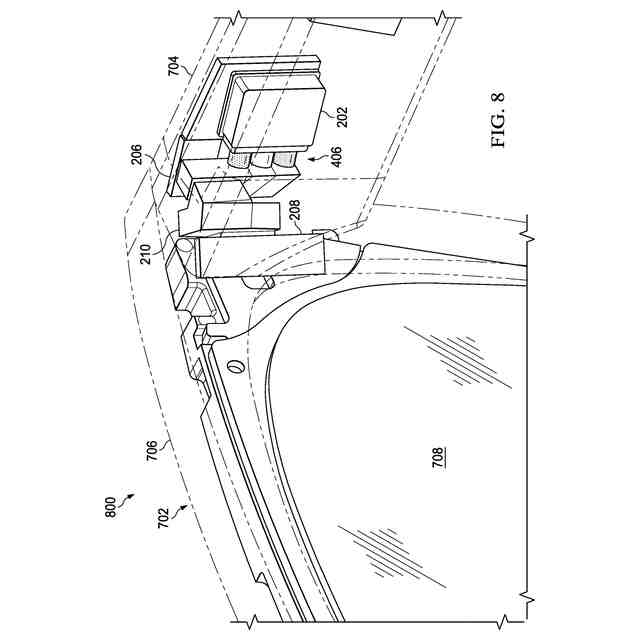 いくつかの実施形態による、WHUD内に配設されたレーザ投影システムの部分透過前面等角図を示す図である。