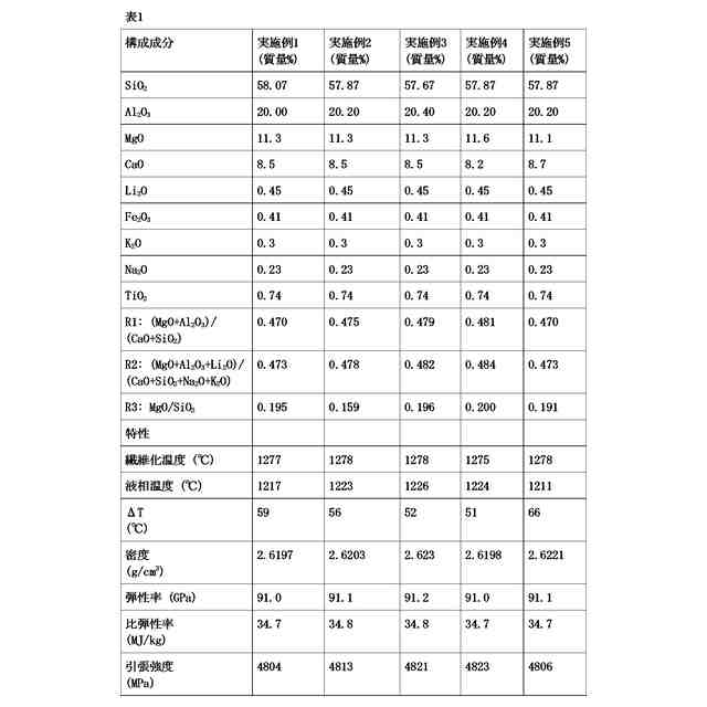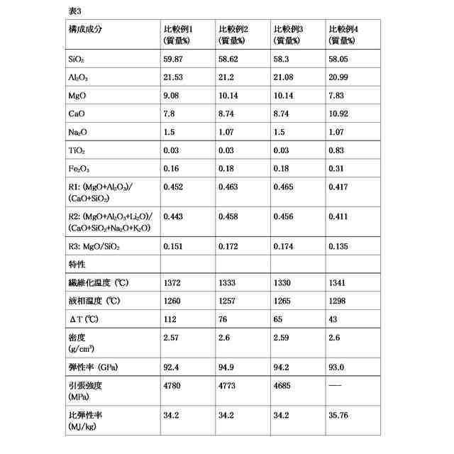 、約14~約17質量%のCaOおよびMgO、ならびに約2質量%未満の多様な構成成分を含有する組成を有する。R-ガラスは、E-ガラスよりもアルミナおよびシリカを多く含有しており、繊維を形成する間、より高い溶融温度および加工温度を必要とする。通常、R-ガラスの場合の溶融温度および加工温度は、E-ガラスのそれらの温度よりも高い。このような高い加工温度は、費用が高価な白金線の内張りされた溶融装置の使用を必要とする。さらに、R-ガラスにおいて、液相温度が成形温度に近づけるには、ガラスは、約1000ポアズまたはそれ近くで慣用的に繊維化されるE-ガラスよりも低い粘度で繊維化されることが必要となる。慣用的な1000ポアズの粘度でR-ガラスを繊維化することにより、ガラスの失透がもたらされる可能性が高く、これは、プロセスの中断および生産性の低下を引き起こす。