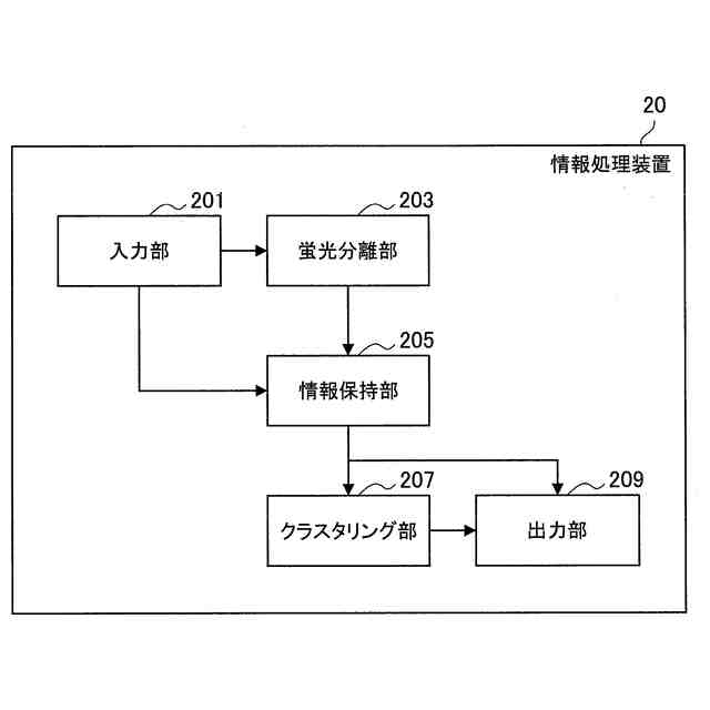 【解決手段】細胞からの光をセンシングした結果である第1のデータと、前記第1のデータを複数の蛍光に分離した結果である第2のデータとを対応付けて保持する情報保持部205と、前記第2のデータに基づいて、前記細胞を複数のクラスタにクラスタリングするクラスタリング部と、前記クラスタリング部207によるクラスタリング結果を出力する出力部209と、を備え、前記出力部は、前記複数のクラスタのうちからユーザが選択したクラスタに含まれる前記細胞の前記第1のデータ又は前記第2のデータの少なくともいずれか1つ以上をさらに出力する、情報処理装置。