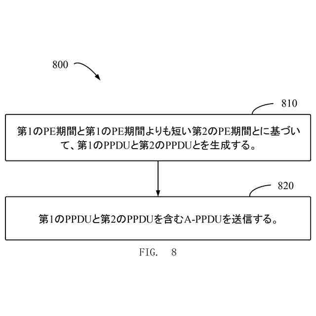 [0006] 本件の第1の態様によれば、通信方法が提供される。方法において、第1のデバイスは、第1の物理層プロトコル・データ・ユニットPPDUと第2のPPDUとを、第1のパケット拡張期間と第1のパケット拡張期間より短い第2のパケット拡張期間とに基づいて生成する。第1のパケット拡張期間は、第1のPPDUに要求される事前に設定されたパケット拡張フィールドの期間を示す。第2のパケット拡張期間は、第2のPPDUによりサポートされるパケット拡張期間を示す。第1のPPDUは第1のパディング・ビットとターゲット・パケット拡張フィールドを含む。第2のPPDUは第2のパディング・ビットとターゲット・パケット拡張フィールドを含む。ターゲット・パケット拡張フィールドは、第2のパケット拡張期間を超えない第3のパケット拡張期間に対応する。第1のパディング・ビットとターゲット・パケット拡張フィールドは、第1のパケット拡張期間より短くない期間に対応している。第1のデバイスは、第1のPPDUと第2のPPDUを含むアグリゲート物理層プロトコル・データ・ユニットA-PPDUを送信する。
