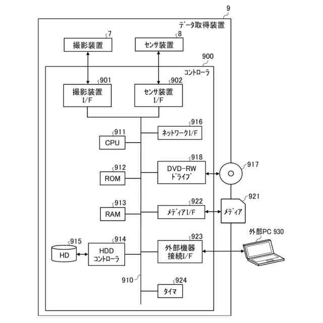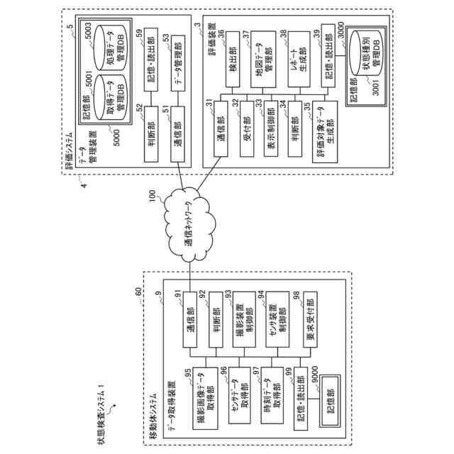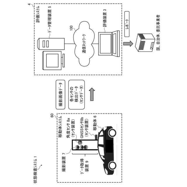 状態検査システム1は、移動体システム60および評価システム4によって構成されている。移動体システム60は、データ取得装置9およびデータ取得装置9を搭載した車両等の移動体6によって構成されている。データ取得装置9は、構造物を計測する計測装置の例である撮影装置7、並びに角度センサ8aおよびGNSS(Global Navigation Satellite System:全球測位衛星システム)センサ8bを有している。GNSSは、GPS(Global Positioning System)または準天頂衛星(QZSS)等の衛星測位システムの総称である。