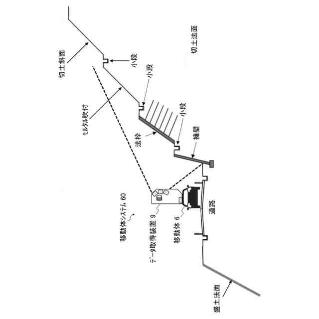 まず、図1および図2を用いて、状態検査システムの概略について説明する。図1は、実施形態に係る状態検査システムの全体構成の一例を示す図である。図1に示されている状態検査システム1は、移動体システム60によって取得された各種データを用いて、道路土工構造物の状態の検査を行うためのシステムである。道路土工構造物とは、道路を建設するために構築する土砂や岩石等の地盤材料を主材料として構成される構造物およびそれらに附帯する構造物の総称であり、切土・斜面安定施設、盛土、カルバートおよびこれらに類するものをいう。以下、道路土工構造物を法面と称する。