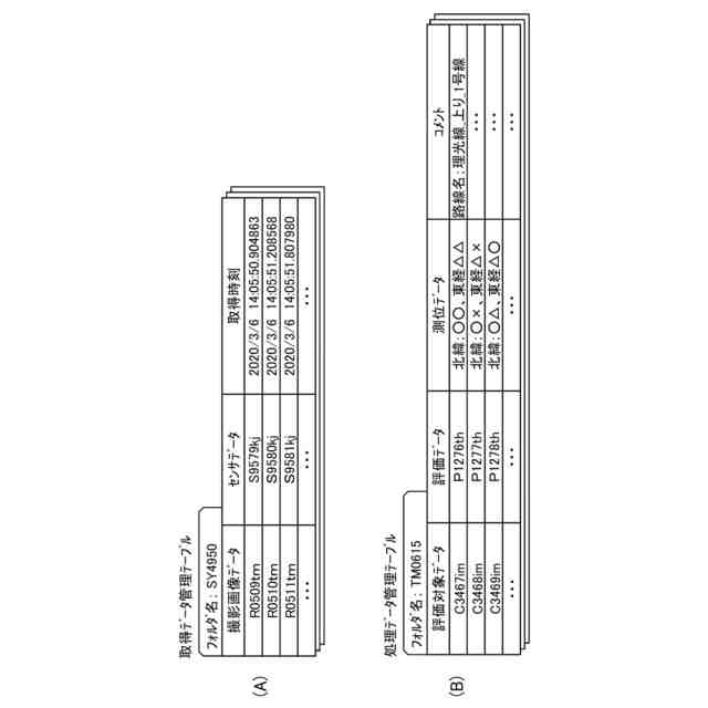 (A)は、取得データ管理テーブルに一例を示す概念図であり、(B)は、処理データ管理テーブルの一例を示す概念図である。