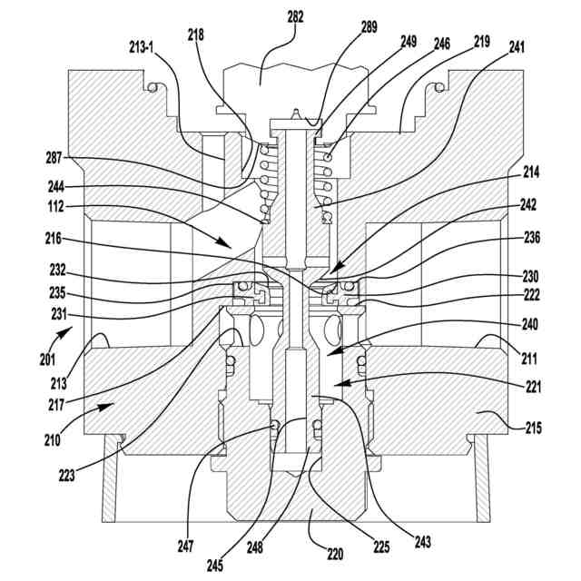 軸方向に延在する上部ステム部と軸方向に延在する下部ステム部との間に配置された中央部を含むポペットであって、前記中央部は、上向きの半径方向に延在するシール部及び下向きの半径方向に延在するポペット肩部を画定する、ポペットと、