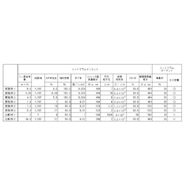 イットリウムの製造方法は通常特許文献2に挙げられるような塩化物を溶融塩電解により析出する手法があげられるが、高純度にのみ注目したものであり、添加物、組織に関する記載はない。そして、高純度化においては塩化物を利用するのが通常であり、フッ化物を原料として利用しうることは高純度化において困難とされてきた。更に希土類の分離は困難であり、それを両立することもできなかった。また高純度の点からフッ素、酸素が内在したスパッタリングターゲットが用いられることはなかった。また、オキシフッ化イットリウムに関しても、抵抗が高くDC放電ができず、特許文献3のように溶射法でしか作製することができなかった。