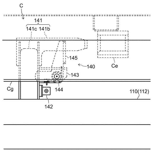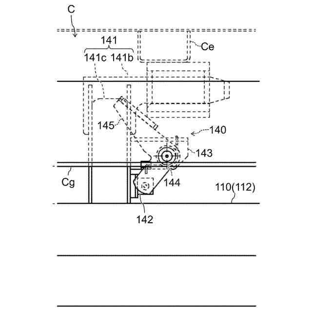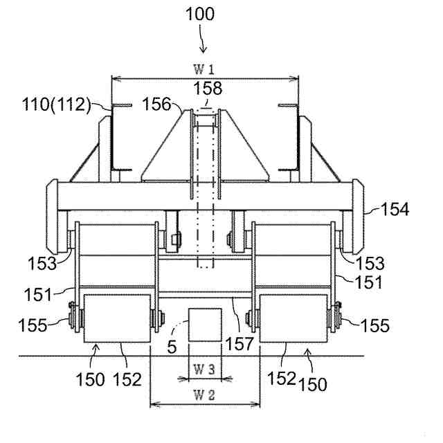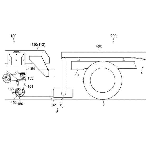 そこで、コンテナ脱着車によりコンテナを前方から積み下ろしできるようにすることを考えると、コンテナ脱着車の車台の下のスペースを活用し、障害となるドローバに屈曲機構を付与する等して地面付近に下ろして、コンテナ脱着車の車台の下側にドローバが受け入れられるようにすることが考えられる。ところが、コンテナ脱着車の後部には、コンテナの積み下ろし時の車台の沈み込みを抑えるローラジャッキが備わっている。コンテナの積み下ろし時にはコンテナ脱着車の車幅方向の中央領域においてローラジャッキが地面付近まで下りるため、トレーラのドローバを地面付近まで下ろしてもローラジャッキが干渉してしまう。そのため、コンテナ脱着車の車台の下のスペースにドローバを受け入れてトレーラの前部にコンテナ脱着車を接近させることも難しい。