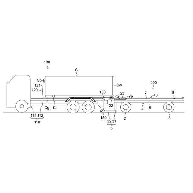 コンテナ脱着車は、トレーラを牽引するトラクタとして用いられる場合がある。この場合、コンテナ脱着車は、牽引するトレーラに対するコンテナの積み下ろしにも用いられ得る。その際、トレーラの前部には、トラクタと連結するためのドローバと呼ばれる連結部材が存在する。ドローバには、トラクタ及びトレーラの旋回走行時におけるトラクタ及びトレーラにそれぞれ積載されたコンテナ同士の干渉が回避できるだけの前後長が確保されている。コンテナ脱着車を用いてトレーラにコンテナを積み込む場合、このドローバと干渉することからコンテナ脱着車をトレーラのデッキ部分に前方から接近させることができない。そのため、特許文献1の図11に開示されているように、一般的にはドローバを避けてトレーラの後部にコンテナ脱着車を接近させ、トレーラに対して後方からコンテナの積み下ろしをする。