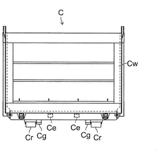 本発明によれば、コンテナの積み下ろし時において、車体の左右方向の安定性を向上させると共に、車台の下のスペースを有効活用することができる。