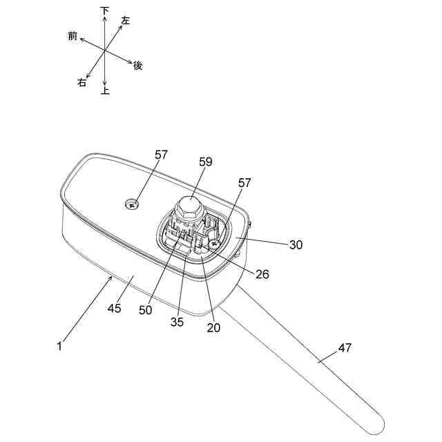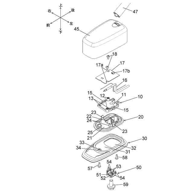 図1~図4に示すように、車載装置1は、導電ベース10、基板17、絶縁ベース20、パッド30、ケース45、ポール部47、ワッシャー50、及びボルト59等を備える。