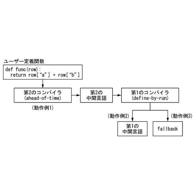 このライブラリ関数apply(self, func)は、自身(Tableオブジェクト)とユーザ定義関数func(row)を受け取って、自身の各行について、ユーザ定義関数func(row)を呼び出して実行するライブラリ関数である。図1に、処理対象のテーブルA1に対する、上記のユーザプログラムの実行結果の一例を示す。ユーザ定義関数は、ライブラリが提供しない機能の実装に利用することができる。