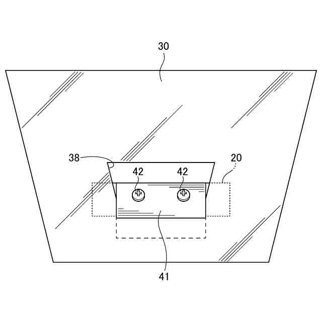第1の態様に従属し得る第2の態様におけるスクリーン反射型表示装置では、前記スクリーンに開口が設けられ、前記表示装置は、前記開口の下縁部に嵌るフック形状体を介して前記スクリーンに固定されている。