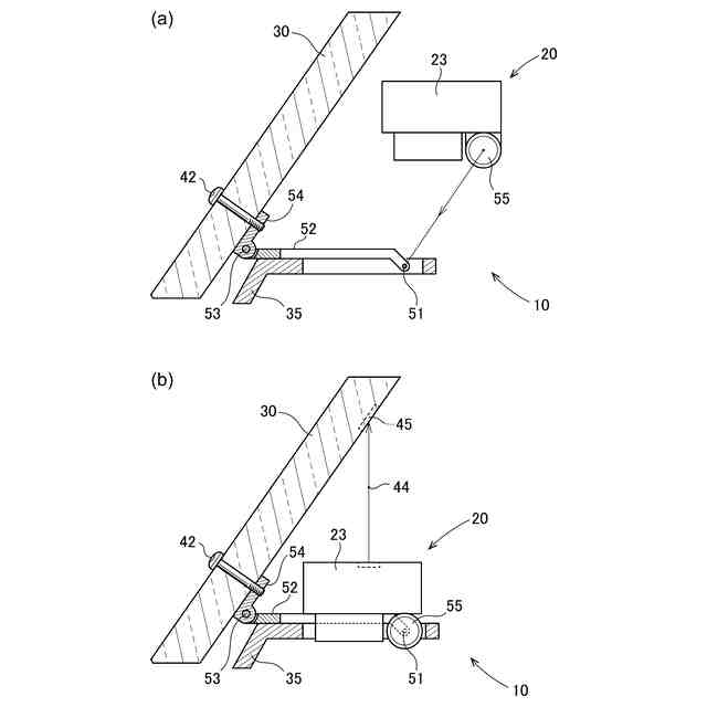 第3の態様におけるスクリーン反射型表示装置では、前記車体外装部に第1回転軸を介して第1ステー部が取付けられ、この第1ステー部の先端に第2回転軸を介して第2ステー部が取付けられ、この第2ステー部に前記スクリーンが取付けられることで、前記スクリーンは、前記車体外装部に上下移動可能に支持され、