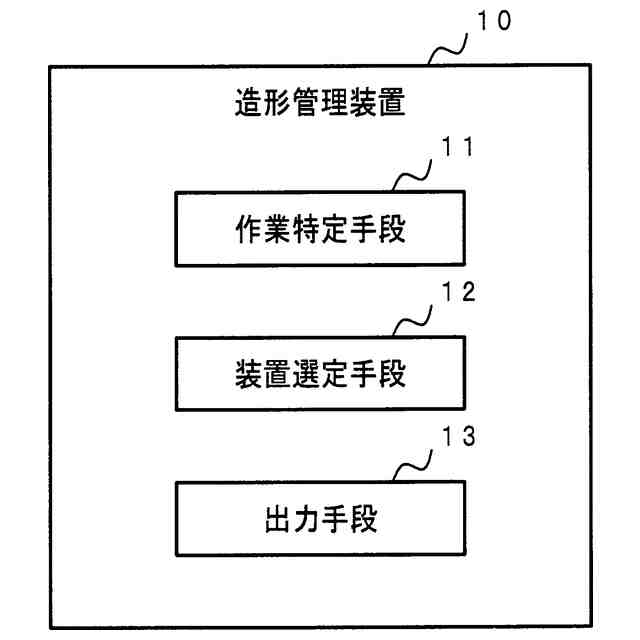 【解決手段】三次元造形物の設計データを含む要求情報に基づいて、三次元造形物の造形に要する造形作業と三次元造形物の検査に要する検査作業とを特定する作業特定手段と、作業特定手段が特定した造形作業を実施可能な造形装置と作業特定手段が特定した検査作業を実施可能な検査装置とを選定する装置選定手段と、装置選定手段が選定した造形装置と検査装置とを示す情報を出力する出力手段とを含む。