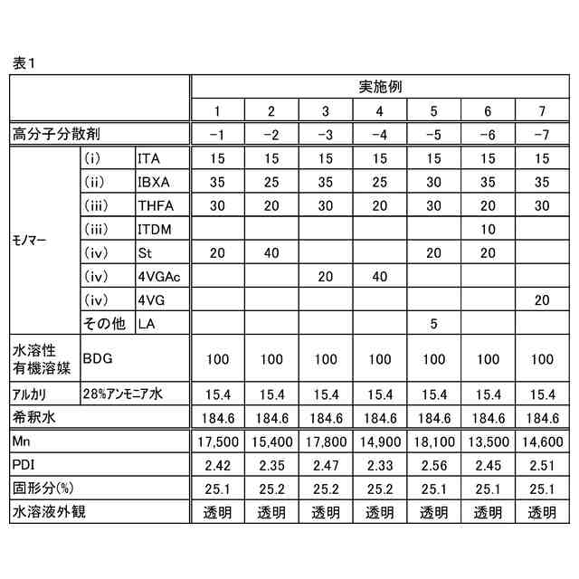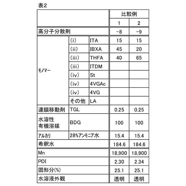 しかし、イタコン酸を用いてラジカル重合する場合には様々な課題がある。イタコン酸のビニル基のα位にはサイズの大きな二つの官能基が結合している。このため、イタコン酸の重合速度、ポリマー転化率、及び他のモノマーとの共重合性は、(メタ)アクリレートやスチレン等の工業的に頻繁に用いられるモノマーと比較して低い。また、カルボキシ基の脂溶性が低いため、イタコン酸は疎水性モノマーと混和しにくい。このため、イタコン酸と疎水性モノマーを共重合する場合には、溶剤よってモノマーを均一化する必要がある。しかし、イタコン酸は水やエタノール等の極性が高い溶剤に溶解するが、疎水性モノマーやポリマーは極性の高い溶剤に溶解しにくい。以上のような理由により、イタコン酸を疎水性モノマーと共重合するのは一般的に困難である。しかし、疎水性モノマーは、顔料粒子に対する親和性を発揮した高分子分散剤を分子設計する上で重要である。