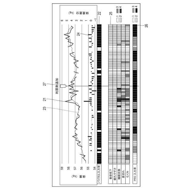 これに対して、従来から心不全手帳を活用することが行われている。心不全手帳は、患者自身が体調、バイタル、自覚症状等の体の状態を記録することにより、患者自身の病気に対する意識を高めるとともに、記録を医師と共有することを主な目的としている。バイタルは、例えば体重、血圧、脈拍数、歩数等でありうる。患者が心不全手帳を記録することにより、患者自身の病気に対する意識が高まり、患者によるセルフケアが促進することが期待される。
