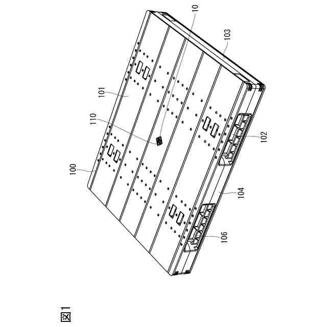 パレット100は、平面視長方形状の上側デッキボード101及び下側デッキボード102と、上側及び下側のデッキボード101,102同士を連結する側壁部103及び桁部104,105と、を有している。側壁部103は、上側及び下側のデッキボード101,102の短辺同士を連結している。桁部104,105には、上側及び下側のデッキボード101,102の長辺の中間部同士を連結する中間桁部104と、上側及び下側のデッキボード101,102の中央部同士を連結する中央桁部105(図3参照)と、が含まれている。側壁部103と桁部104,105との間は、フォーク挿入空間106となっている。また、本実施形態のパレット100は、同一形状の2つの射出成形品100Aが上下で向かい合わせて溶着された溶着パレットであり、上下をひっくり返しても使用可能になっている。