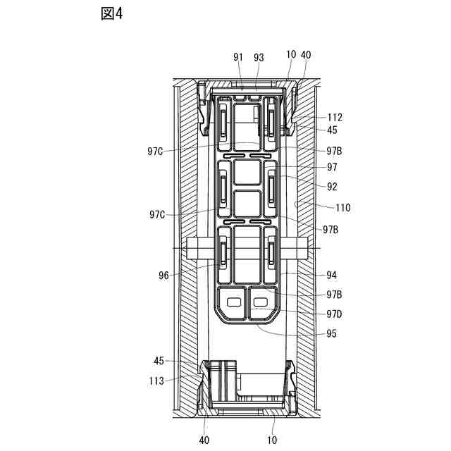 図1及び図2に示すように、パレット100の中央には、無線通信機器90を収容するための貫通孔110が形成されている。詳細には、パレット100の中央桁部105(図3参照)の中心に、断面略正方形状の角筒部111が形成され、その内側が貫通孔110となっている。貫通孔110は、開口の各辺がパレット100の各辺に対して45度傾斜する向きになっている。