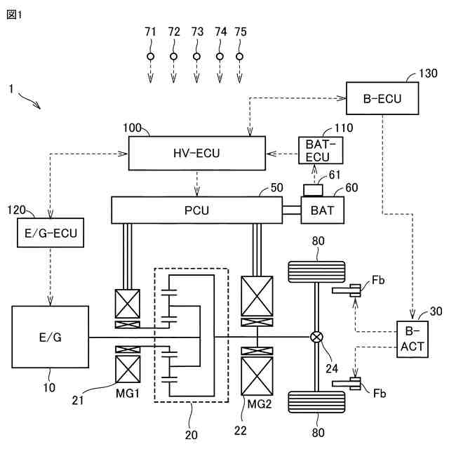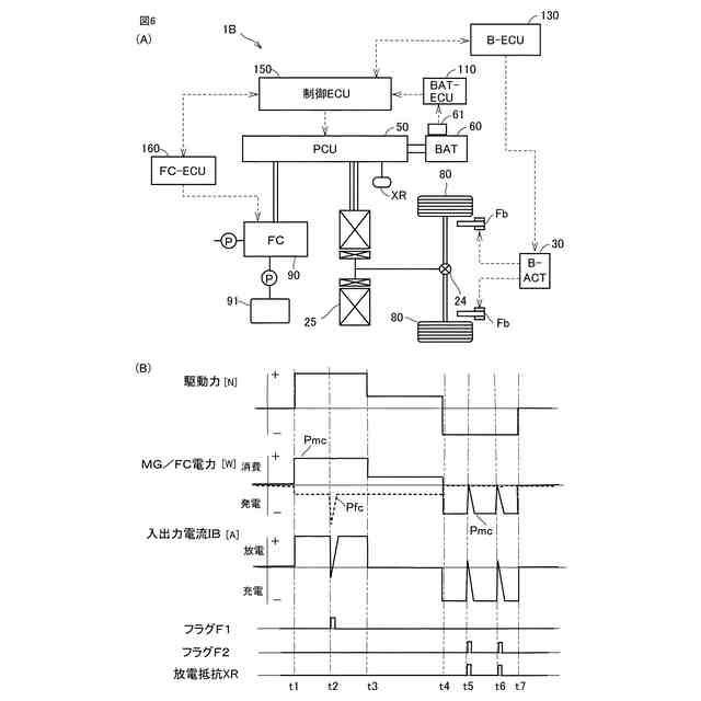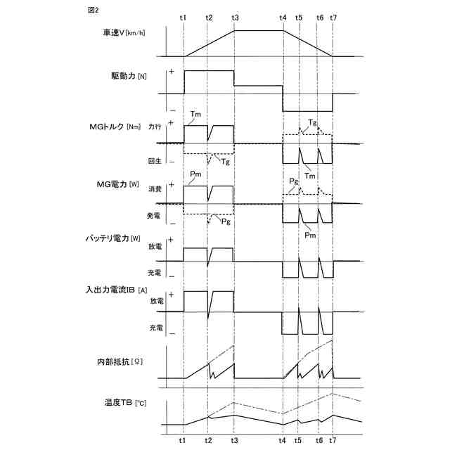 【解決手段】車両は、エンジンの出力を第1MGと第2MGに分割する動力分割装置を備えたハイブリッド車両である。第1MGは、主に、エンジンに駆動され発電する。第2MGは、第1MGの発電電力、バッテリの放電電力によって、駆動輪を駆動するとともに、車両の減速時に回生発電を行う。車両の走行時、バッテリからの放電が第1所定期間継続し、カウンタC1が閾値s1を超えると(時刻t2)、第1所定時間、駆動力を維持した状態で、バッテリの充電を行うよう、エンジン、第1MG、および第2MGを制御する。バッテリの分極が解消して、内部抵抗の増加が抑止され、バッテリが高温になることを抑制できる。