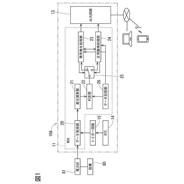 図1~図2を参照して本開示に係る第1実施形態の異常判定装置10A及び異常判定プログラムPG1について説明する。図1に示すように、異常判定装置10Aは、例えば、工場に配置され、その工場の電力計81に接続されると共に、インターネットを含む通信ネットワークに接続されている。また、電力計81は、例えば、工場の設備80の消費電力と累計の消費電力量とを計測する。