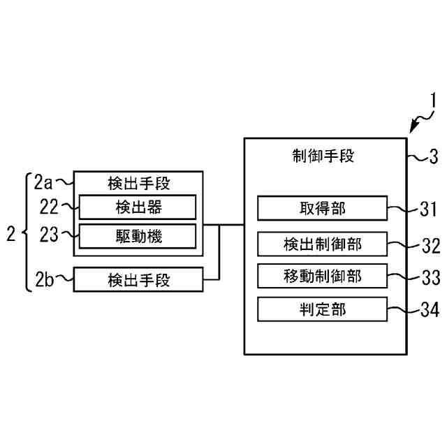 前記制御手段は、移動条件が満たされた場合に、前記駆動機を制御することで、停止している前記検出器を回転移動させた後、検出範囲が直前とは異なるような位置で前記検出器を停止させる、