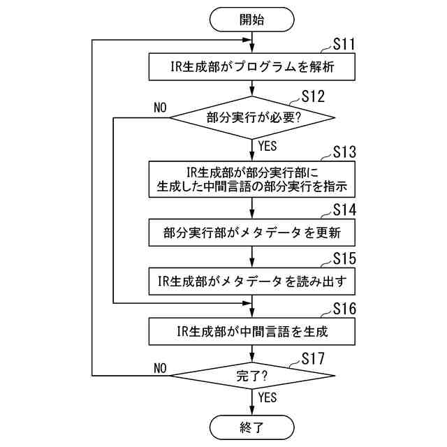 特許文献1には、コンピュータプログラムコードの中間言語(中間表現(IR:Intermediate Representation)とも称する。)を生成する方法について開示がある。プログラムの実行時に中間言語を生成し、生成した中間言語を実行する処理方式において、一連の処理の中間言語を生成しようとすると、一連の処理の一部について中間言語を実行しないと、その後の処理についての中間言語の生成を行うことができない、もしくは効率的な中間言語の生成を行うことができない場合がある。