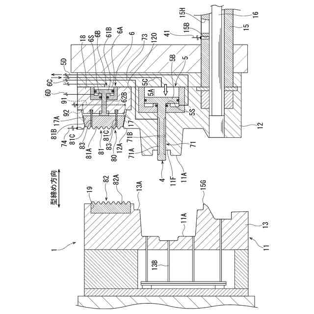 前記金型は、固定型面を有する固定型と、可動型面を有し、前記固定型に対して型締め方向に進退動可能とされた可動型とを含み、