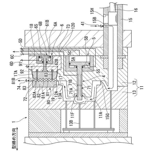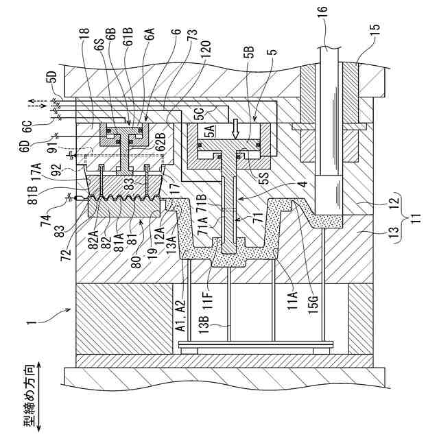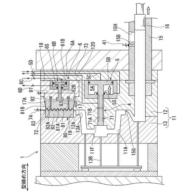 そして、このダイカスト装置では、キャビティ内のガスを排出するための排出経路にチルベントが設けられている。チルベントでは、キャビティと連通するチルベント排出路を介してアルミニウム溶湯に含まれる窒素等のガスを外部に排出する。これにより、鋳造品におけるガス巣の発生が抑制される。