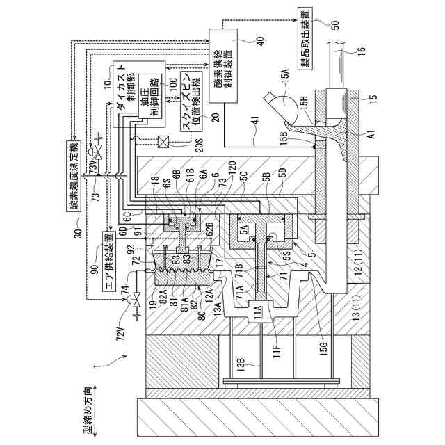 特許文献1に従来のダイカスト装置が開示されている。このダイカスト装置は、金型のキャビティ内に酸素を供給し、排出経路を介してキャビティ内のガスを外部に排出することでキャビティ内を酸素で置換し、キャビティ内にアルミニウム溶湯を充填して鋳造品を製造する。