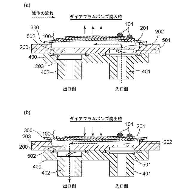 高い精度で定量の流体を圧送するポンプとしてダイアフラムポンプが知られている。ダイアフラムポンプは、圧力を発生させるアクチュエーターと、アクチュエーターの発生する圧力により変形するダイアフラムと、ダイアフラムの変形に伴って容積が変化するポンプ室と、を備えている。ダイアフラムの変形に伴ってポンプ室の容積が拡大すると、ポンプ室内部の圧力が小さくなり、ダイアフラムポンプの外部から流体がポンプ室に流入する。一方、ポンプ室の容積が縮小すると、ポンプ室内部の圧力が大きくなり、ポンプ室から外部へ流体が流出する。また、ダイアフラムポンプは、流体がポンプ室に流入する流入孔及び流体がポンプ室から流出する流出孔に逆止弁を配置することで、一方通行の流体の流れを作りだす。ポンプ室への流体の流出と、ポンプ室からの流体の流出を繰り返すことでポンプとして機能を果たす。