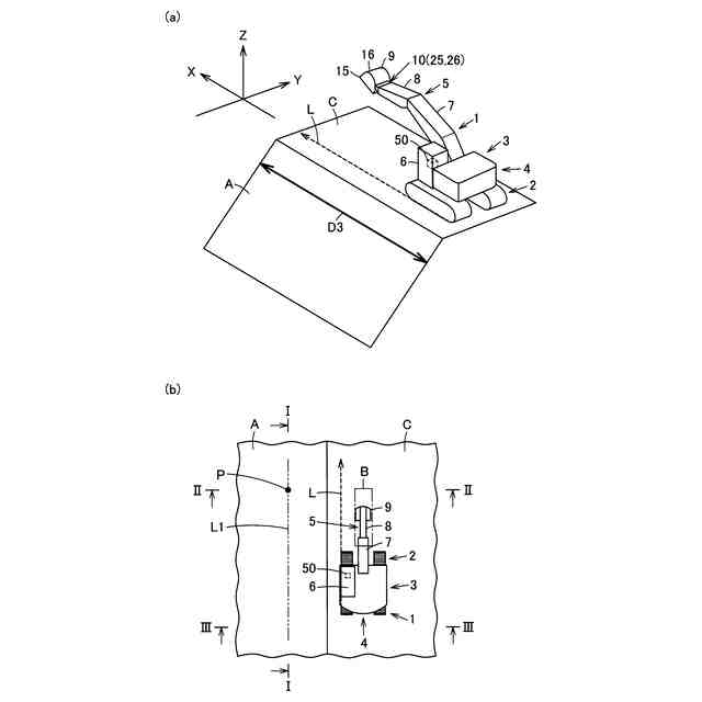 同上作業機械および作業支援装置による自動制御を実施する施工面を示し(a)は斜視図、(b)は平面図である。