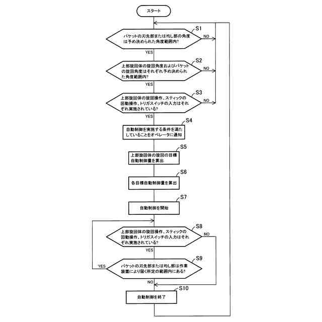 同様に、予め教示操作などにより設定された所定の軸に沿ってフロント作業装置を動作させることで、上記の課題を解決しようとするものが知られている(例えば、特許文献1参照)。しかしながら、この構成の場合、均し操作による実作業を開始するまでに教示操作などの煩雑な準備作業が必要となる。加えて、バケット上のある点が平面視で設定された教示軸に沿って移動するように旋回動作を自動制御するものであるから、オペレータは依然として施工面に対するバケット高さやバケット底面の角度を調節しながらフロント作業装置を連動操作する必要があり、主にフロント作業装置の向きに対して横(左右)方向にバケットを直線状に動作させて均し作業をする場合には、やはり操作は容易でない。
