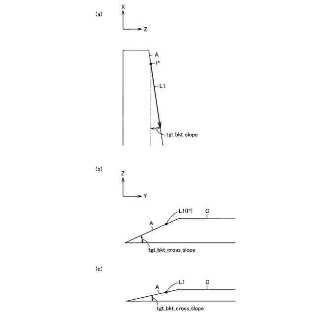同上作業機械による施工面の傾斜を示し、(a)は図5(b)のI-I相当位置の断面図、(b)は図5(b)のII-II相当位置の断面図、(c)は図5(b)のIII-III相当位置の断面図である。