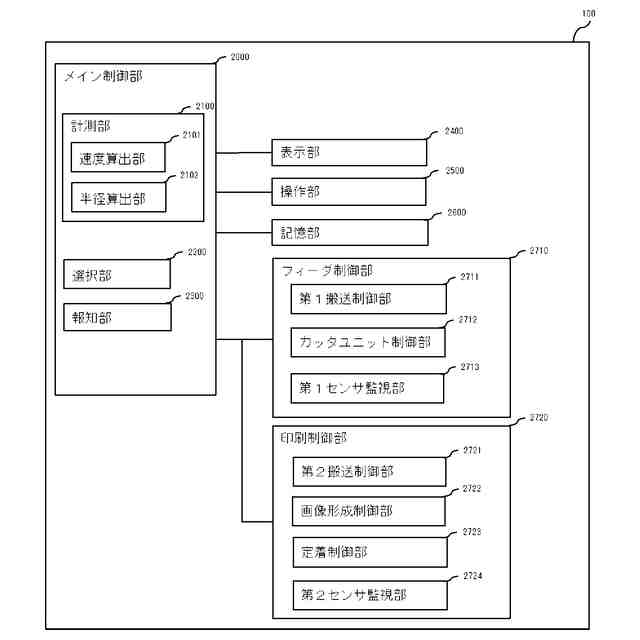 フィーダ部1000は、ロール紙Pを支持するロール紙ホルダ1001と、ロール紙ホルダ1001の回転を検出する第1回転検出センサ1002と、ロール紙Pが画像形成装置100にセットされているかを検出するロール紙有無センサ1003と、ロール紙Pを搬送する第1搬送ローラ対1004と、第1搬送ローラ対1004で搬送されたロール紙Pの通過を検出する通過センサ1005と、ロール紙Pを切断するカッタユニット1006と、ロール紙Pを印刷部1100へ搬送する第2搬送ローラ対1007と、切断されたロール紙Pの後端の通過を検出するカッタアウトセンサ1008と、フィーダ制御部2710と、を有する。
