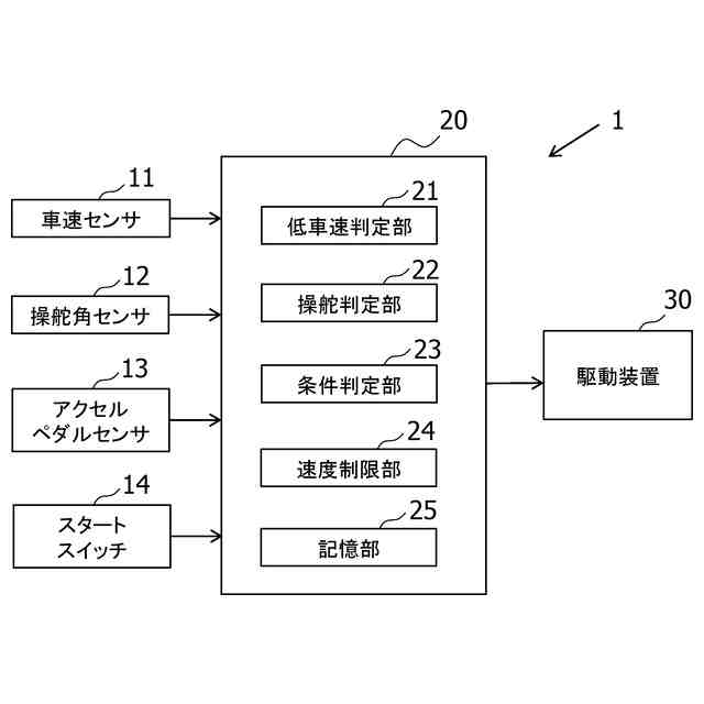 上述した特許文献1に記載の車両制御システムにおいては、駐車場における速度制限を実行するために、駐車場への入場と退場とを検知するために、車載機と駐車場に設けられた路側機との間の狭いエリアにおける無線通信を行う外部システムを設ける必要があり、システムが複雑かつ高価になってしまう。また、路側機を備えていない駐車場では、駐車場への入場と退場とを検知することができず、駐車場においてアクセルペダルの誤操作による急加速や急発進などを抑制するための車両の速度制限を実行することができない。