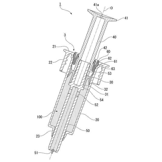 (3)前記容器本体は、前記計量部材を着脱可能に装着する装着筒を備え、前記装着筒は、前記注出筒の下端部が係合する第1筒部と、前記第1筒部の上端に連設され、前記シリンダの周壁を収容する第2筒部と、前記装着筒を貫通し、前記装着筒の内側を前記容器本体の内側に連通させる連通流路と、を備えてもよい。