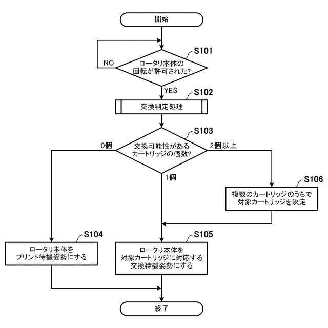 【解決手段】交換制御部(エンジン制御部)は、カートリッジの移動指示を受信した場合に、ロータリ本体を交換姿勢となるまで回転させ、更に、カートリッジを装着位置から退避位置へ移動させる。交換制御部は、カートリッジ内のトナー残量の取得結果が所定の条件を満たした場合に、ロータリ本体を交換姿勢に近づくよう回転させ、待機姿勢となるまで回転させる処理を行う。