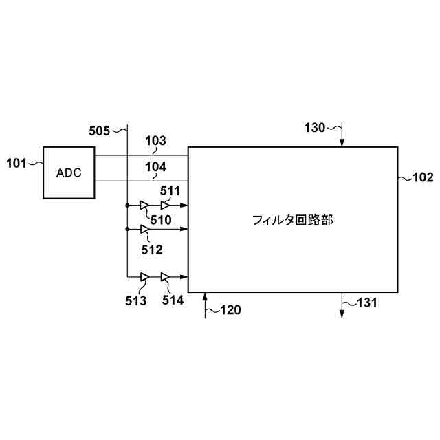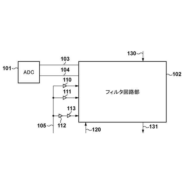 本発明を適用した半導体集積回路の例について図1により説明する。図1は、アナログデジタル変換器(ADC)101とフィルタ回路部102を示している。イメージセンサなどの半導体集積回路には、イメージセンサからのアナログデータをデジタルデータに変換するADC101とフィルタ回路部102とが多数実装されている。ADC101はクロック103とクロックイネーブル104をフィルタ回路102へ出力する。クロックイネーブル104は、ここでは1本しか配線が示されていないが、実際は多ビット信号を伝送するための複数本の配線があってもよい。以下では、クロックイネーブル104はADC101から32ビット分に相当する32個が出力されているものとして説明する。ADC101としては、スロープ型A/D変換回路、逐次比較型A/D変換回路、デルタシグマ(ΔΣ)型A/D変換回路などが用いられるが、これらに限定されるものではない。
