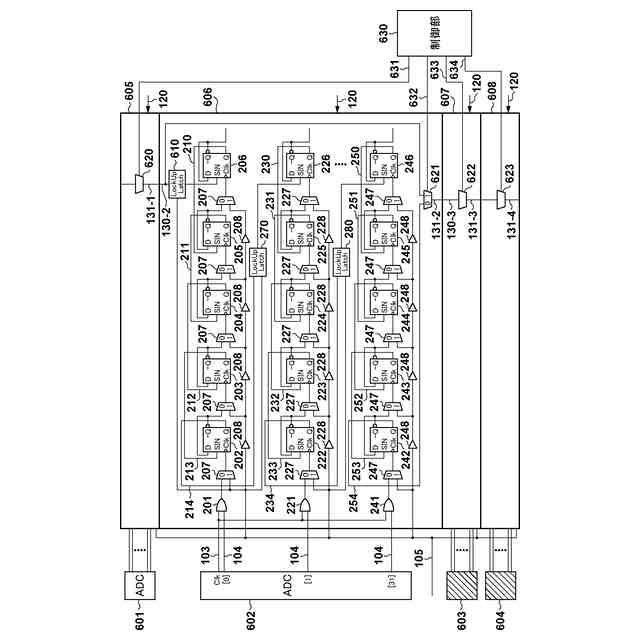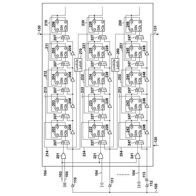 以下に論理回路をスキャンテストする例について説明する。本実施形態ではスキャンテストの対象としてフィルタ回路部102をテストする例について説明する。テストの対象はフィルタに限らず、他のタイプの論理回路であってもよい。スキャンテストはテストクロック105に基づいて行われる。テストクロック105はフィルタ回路部102のスキャンテストに使用されるクロックである。テストクロック105は、フィルタ回路部102に配置された複数のフィルタ回路に対して、各フィルタへ複数に分岐されて入力される。この例ではフィルタ回路部102に、ADC101の出力ビット数32に対応した32個のフィルタ回路が配置される。テストクロック105は各フィルタ回路に対して分岐されて供給される。ADC101の出力ビット数に応じて配置されるフィルタ回路をまとめて1つの論理回路グループと称することができる。本実施形態では、32個のフィルタ回路により1つの論理回路グループが構成されている。論理回路グループを構成する論理回路の数はこれに限定されず、必要に応じて所定数の論理回路から構成できる。本実施形態のフィルタ回路部102はA/D変換されたデータに含まれるノイズを除去するものであり、デシメーションフィルタなども含まれる。