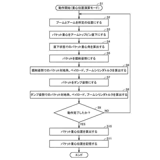 バケットの重心がアームトップピンの直下に位置した直下状態でバケットの重心角が算出される。バケットの掘削姿勢において第1バケット対地角、第1ペイロード値およびブームシリンダの第1トルクが算出される。バケットのダンプ姿勢において第2バケット対地角、第2ペイロード値およびブームシリンダの第2トルクが算出される。重心角、第1バケット対地角、第1ペイロード値、第1トルク、第2バケット対地角、第2ペイロード値、および第2トルクを用いてバケットの重心位置の座標が算出される。